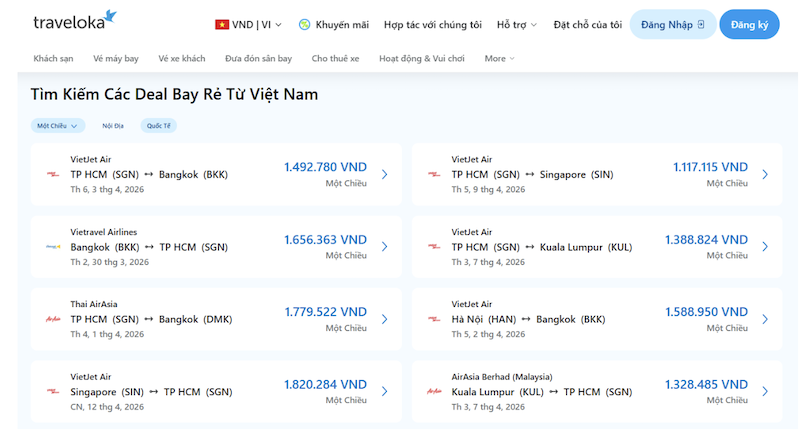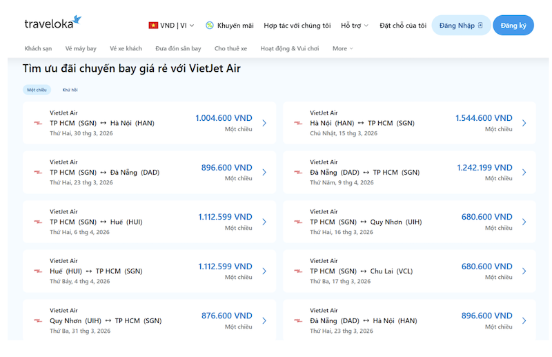 Một trong những lý do khiến nhiều người lựa chọn Traveloka là giao diện thân thiện và thao tác đơn giản. Chỉ cần nhập điểm đi, điểm đến và thời gian bay, hệ thống sẽ ngay lập tức hiển thị danh sách chuyến bay phù hợp. Người dùng có thể dễ dàng lọc chuyến bay theo hãng hàng không, thời gian khởi hành hoặc mức giá để tìm được lựa chọn tối ưu nhất. Nhờ tính năng này, việc tìm kiếm vé máy bay VietJet giá rẻ trở nên nhanh chóng và tiện lợi hơn rất nhiều.